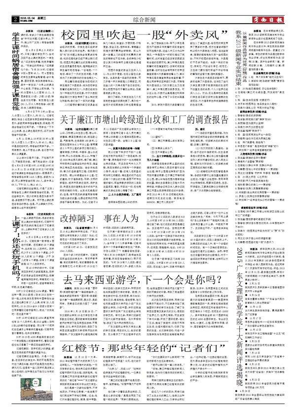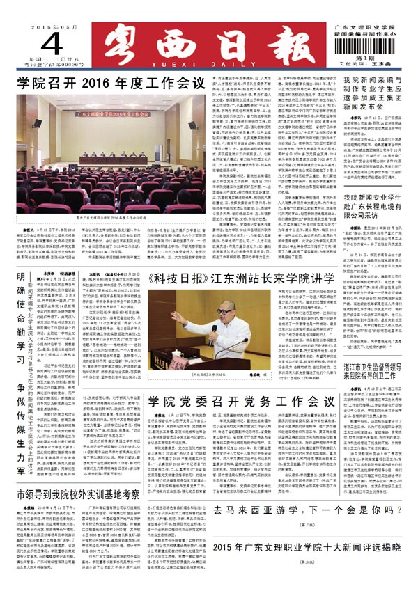 今天读者看到的《粤西日报》,不仅是传统媒体与现代媒体的融合,更是学院新闻采编专业学生的实训平台,使他们通过《粤西日报》提高自己的办报水平;更使读者和广大学生及时了解学院周边地区经济发展及学院的新动态。