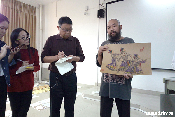 侯主任开始对他心仪的作品进行点评:这张画从手法上非常生动,色彩很统一。并且紫黄颜色搭配本身是自相矛盾的,但是这个对比却合成了舞蹈与唱曲的力度,选用牛皮纸这色彩也与画面人物的颜色很相对称。给人带来一种岭南文化朴实的画面视觉。