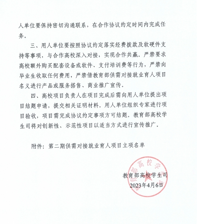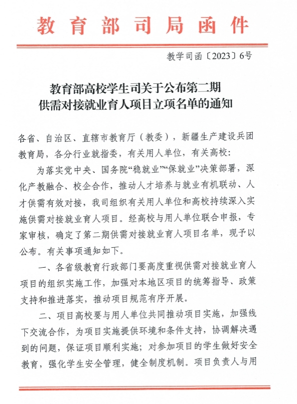 供需对接就业育人项目是教育部为落实党中央、国务院“稳就业”“保就业”决策部署,深化产教融合、校企合作,推动人才培养与就业有机联动、人才供需有效对接,由教育部高校学生司组织发起,有关用人单位和高校共同实施。项目经高校申请、用人单位申报、专家审核、立项单位信息核查,最终确定项目名单。