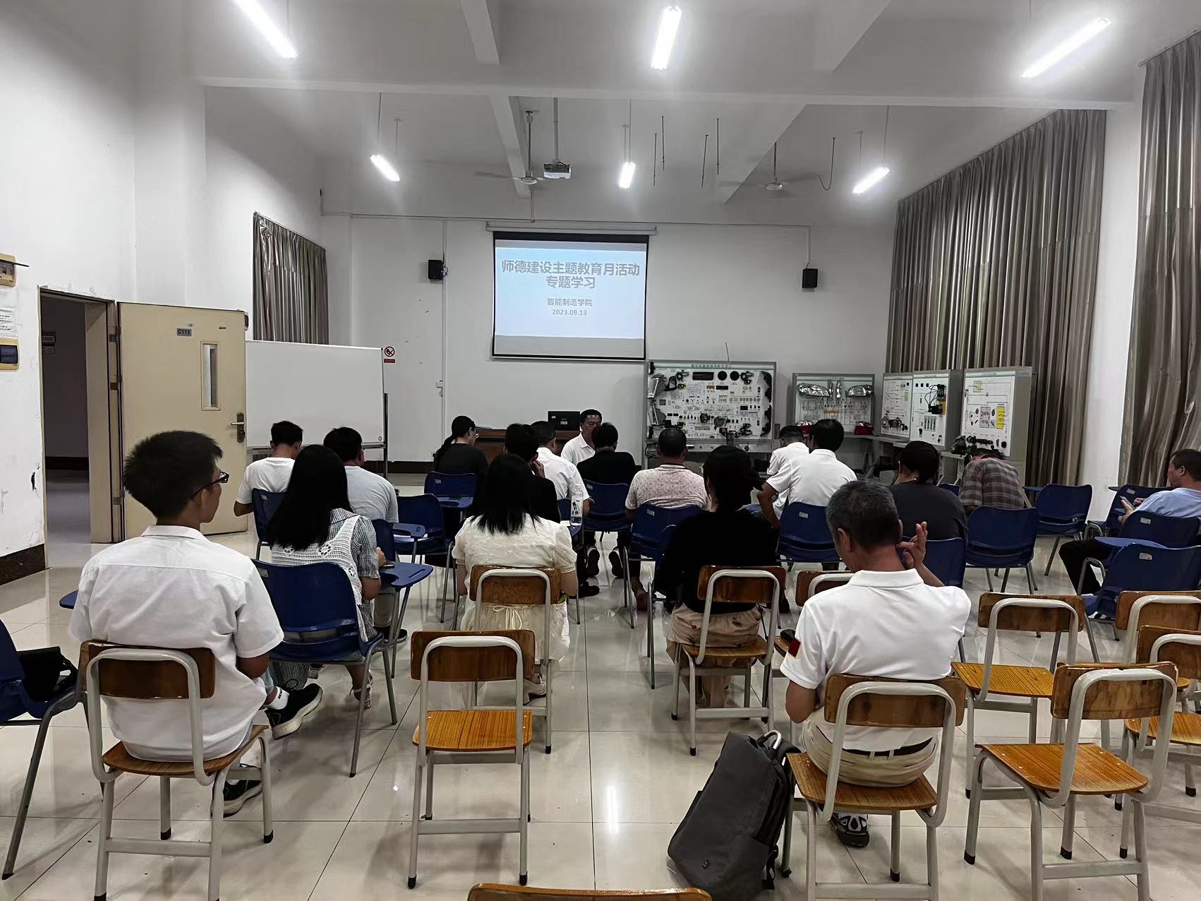 为深入学习贯彻落实党的二十大精神,认真学习习近平总书记关于教育的重要论述特别是关于师德师风建设的重要指示批示精神,全面提升学校师德师风建设水平,结合教育厅有关师德师风专项教育和治理工作要求,智能制造学院于2023年9月13日下午组织全体教师开展“师德师风建设”专题教育。