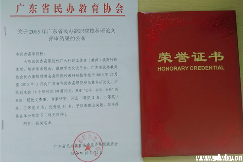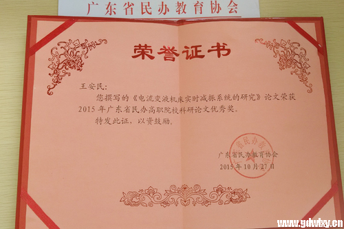 为帮助民办高职院校广大工作者(教师)提高科技素质,培育学术交流平台,广东省民办教育协会民办高校联席会高职院校教科研协作组于2014年12开始向全省各民办高职院校征集科研论文,近日,我系王安民主撰写的论文《电流变液机床实时减振系统的研究》荣获2015年广东省民办高职院校科研论文“优秀奖”。