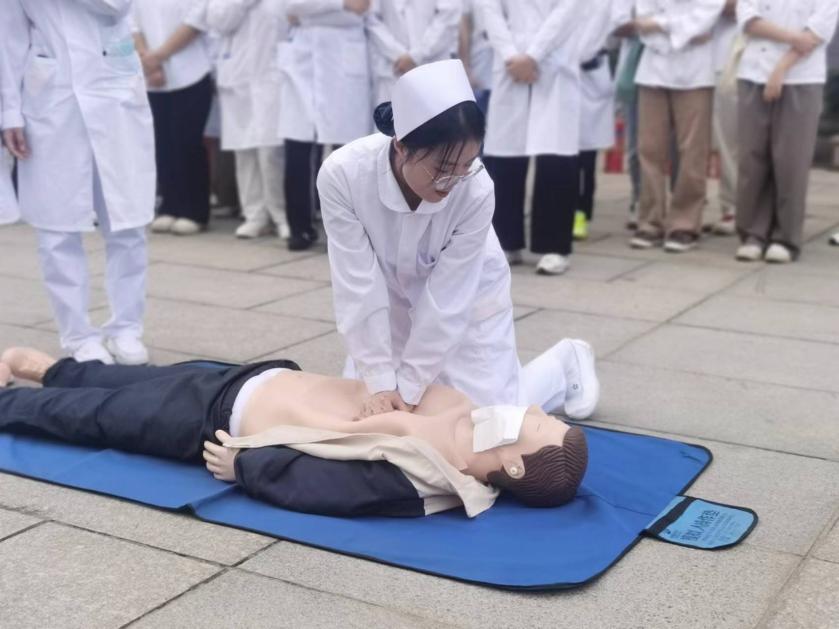 在专业人员对灭火器基本操作要领和注意事项进行讲解后,大家踊跃使用灭火器进行模拟火情灭火,护理专业急救协会的学生现场讲解急救常识,并进行心肺复苏演示,普及自救与互救知识。