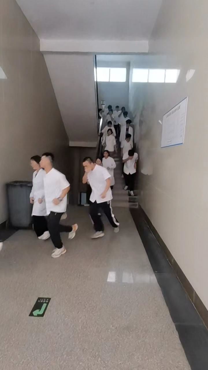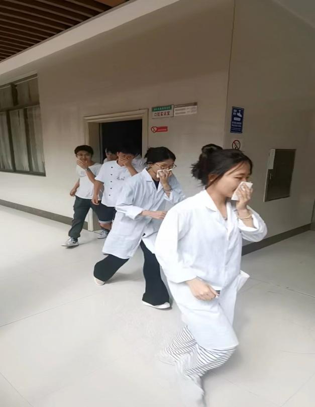 炎炎夏日,艳阳高照。5月22日15:00,伴随着一阵急促刺耳的火灾警铃响起,正在实训楼8楼上课的所有师生迅速进入紧急状态,教师提醒本实训室内学生开始有序疏散,各个实训室人员在安全员引导下,立即找到逃生路线,所有人员用毛巾、袖口、手帕等捂住鼻口,采取弯腰俯身姿势快走,避免吸入浓烟。在老师带领下,各个实训室的学生迅速通过应急通道转移到安全空旷场所。紧接着各班迅速整理队伍,清点人数,确保无一人遗漏。整个过程不到3分钟,情况紧急,场面可控,处置果敢。原来,这是一次实训室消防安全应急演练。
