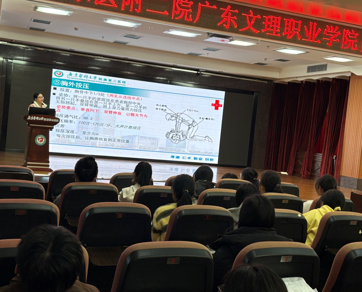 到广东医科大学附属第二医院走访时,医院正在为我校实习生专场培训急救知识,教学部李子红老师带领我们前往培训现场观摩,培训由教学部江部长亲自主讲。