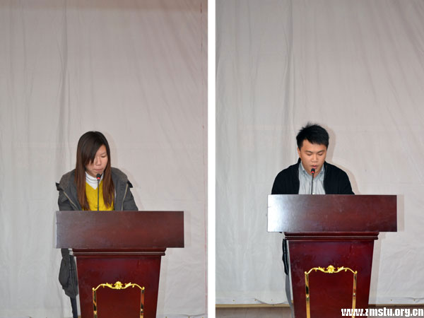 国家奖学金获得者(左)与先进班集体获奖代表(右)发言