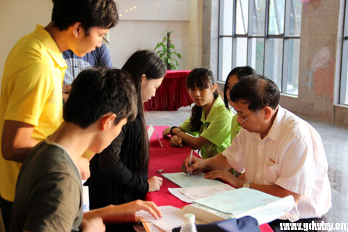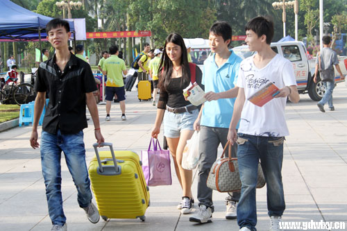 从踏入廉江的那一刻起,2013级新生便体会到了广东文理对自己的关心和照顾。新生报到期间,火车站、汽车站分别有我院派出的校车驻点等候。各迎新现场,各接待点前,各项迎新工作紧张而有序、喜庆而祥和。工作人员个个面带笑容,按照各自的分工,耐心细致地查验着录取通知书、身份证等材料和证件。新生们在亲切、温馨、隆重的氛围中填写新生入学资格审查登记表、交录取通知书、办理交费手续、领取校园卡、领宿舍钥匙。