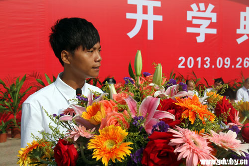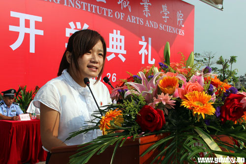 随后,学院董事会董事长宣承志走上讲台向全体新生致辞:首先向来自全国各地的莘莘学子表示热烈欢迎和诚挚的祝贺。宣承志董事长在致辞中介绍说,我院是一所美丽的千亩生态园林式高等学府,校园环境优雅,常年绿树成荫,繁花飘香。现任中共中央政治局常委、全国人大常委会委员长张德江同志任广东省委书记时来我院视察,对我院取得的成绩给予了高度评价。国家级刊物《大众摄影》杂志社指定我院为全国摄影家的采风单位。2013级新同学,是学院发展的生力军。大学是人生一个重要的转折点,也是一个新的起点。最后,宣承志董事长希望同学们在今后的大学生活中热爱学习、脚踏实地、不断进步。学院将继续努力,为建设成为全国一流的品牌大学而不懈奋斗。