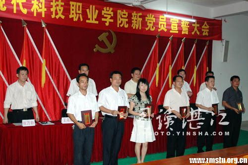 2007年6月27日,湛江现代科技职业学院举行了新党员宣誓仪式。17名教职工和23名学生在党旗下庄严宣誓。这40名新党员,是学院在今年上半年从210名教职工和1600名学生中分三批发展的,为学院党组织建设增加了新生力量。