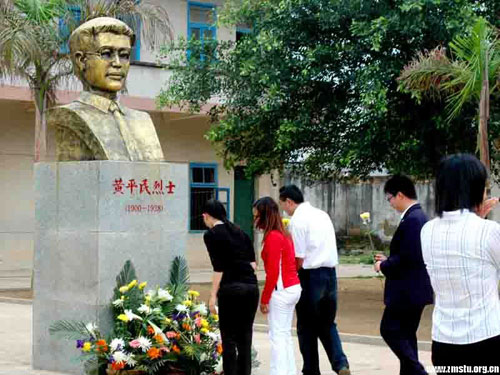 师生们怀着崇敬之情,向烈士敬献花篮,缅怀先烈。黄平民烈士学校校长介绍了烈士的生平事迹。据介绍,黄平民烈士生前在广东高州中学毕业后考取法国勤工俭学半公费生。1923年在法国加入中国共产党,后被派往莫斯科“东方劳动者共产主义大学”学习。1925回国,曾在中共两广区委军事部工作,参加广州起义,受伤;他先后担任中共南路特委书记,中共广东省委常委候补委员。1928年12月牺牲。为纪念黄平民烈士,在原广东省省长刘田夫及老同志们的倡导及关心下,1990年1月,石岭镇合江小学改名为廉江市黄平民烈士学校,并正式挂牌。它是廉江市第一间烈士纪念学校,是德育教育基地。
