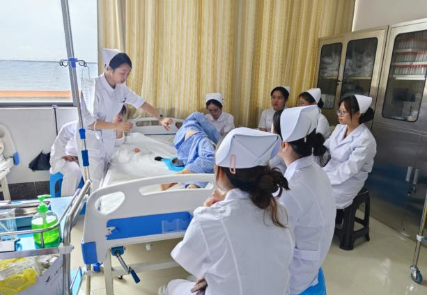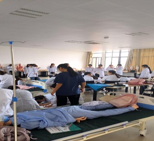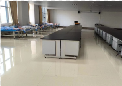 基础护理实训室占地约433平方米,按照医院病房布局设置,配有多媒体、护理床、床头柜、多功能模拟人、高级男性导尿模型、高级女性导尿模型、医用护理车等,可同时容纳50余名学生进行操作练习。练习项目有铺床、口腔护理、吸痰、导尿、灌肠、心电监护等,为使学生和临床实现无缝对接,我们还准备了学生仿真模拟训练。