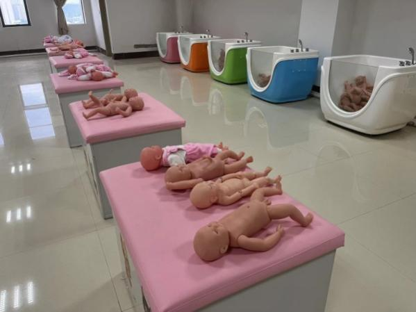 实训室配备有婴儿抚触按摩台,婴幼儿模型,婴幼儿洗澡水池,人体造型盆以及带淋浴花洒、冷热水开关等,方便进行婴幼儿沐浴和抚触实训教学。