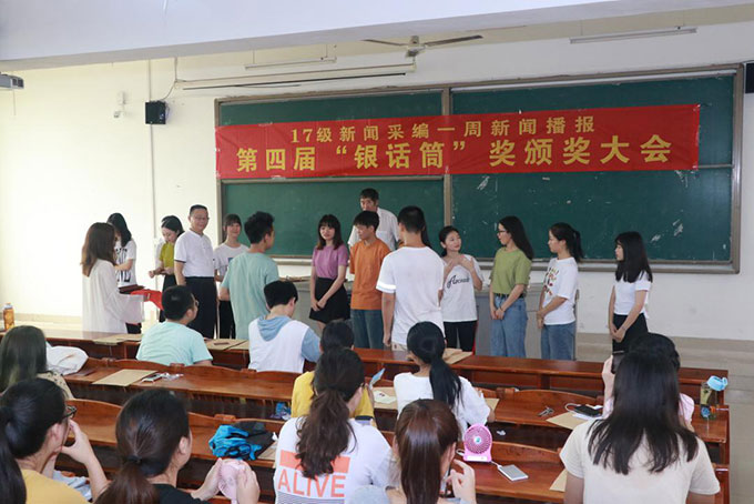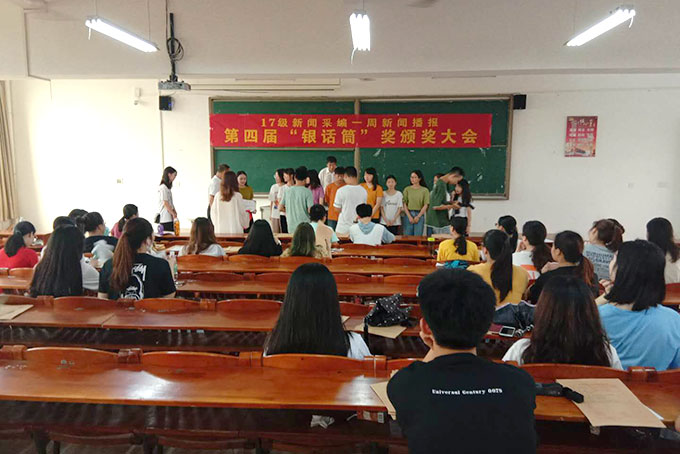 【学生记者 罗景榆】2019年6月12日,在学院第一教学楼A404教室时时传来热烈的掌声。这里正在举行新闻采编与制作专业第四届银话筒奖颁奖仪式。颁奖仪式由新闻采编与制作专业马晓方老师主持,艺术与传媒系主任邓天杰教授出席颁奖仪式并为获奖学生颁奖。