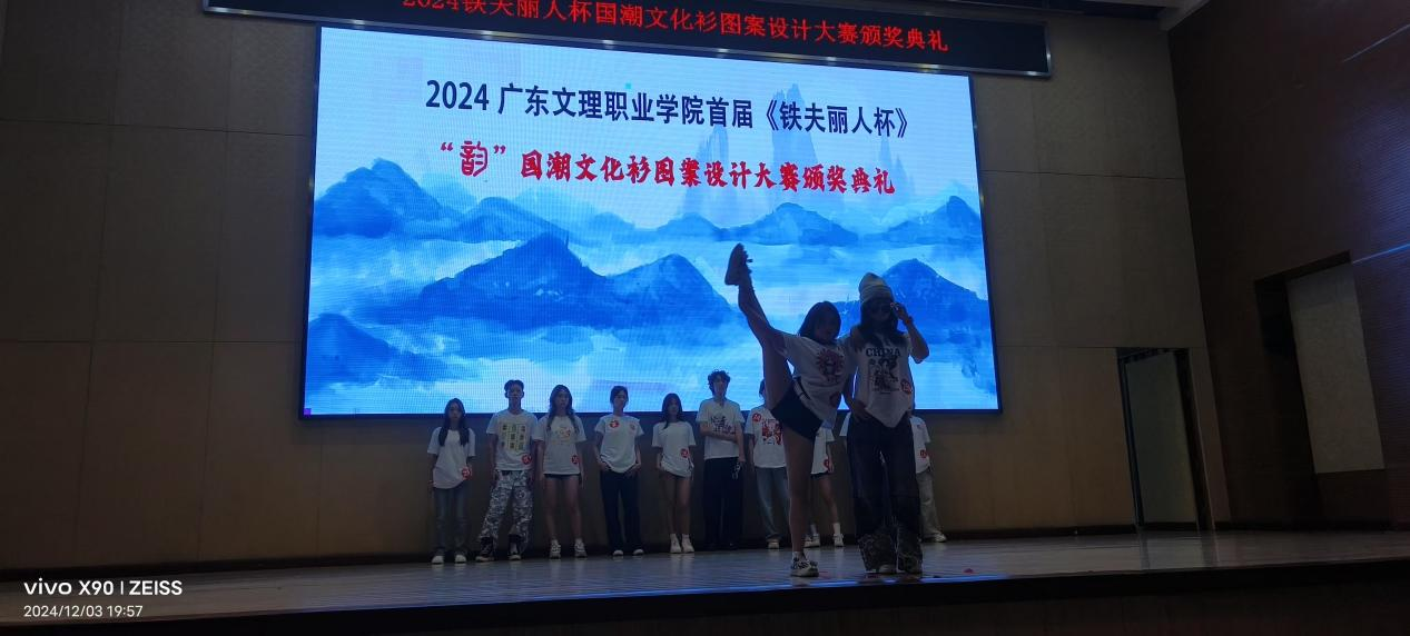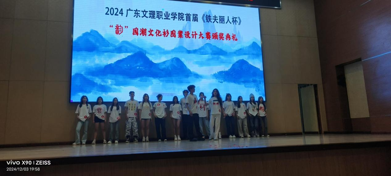 广东文理职业学院艺术与传媒学院成功举办的首届《铁夫丽人杯》“韵”国潮图案文化衫比赛圆满落下帷幕。2024年12月3日,学校在实训楼十楼报告厅举行颁奖仪式。