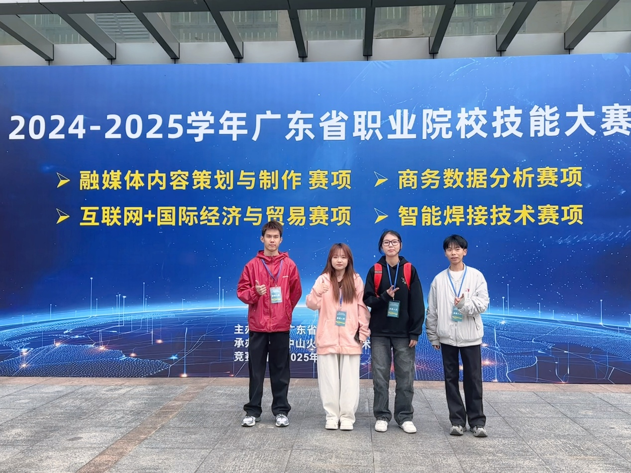 2025年3月9日,2024-2025学年广东省职业院校技能大赛“融媒体内容策划与制作”赛项在中山圆满落幕。由艺术与传媒学院陈艳菲、张金玲老师指导的2023级新闻采编与制作1班曾科、张靖榆、杜兴佩、林泽楷同学,经过数天的刻苦准备,在此次大赛中凭借扎实的专业知识和出色的团队协作能力,荣获广东省二等奖。