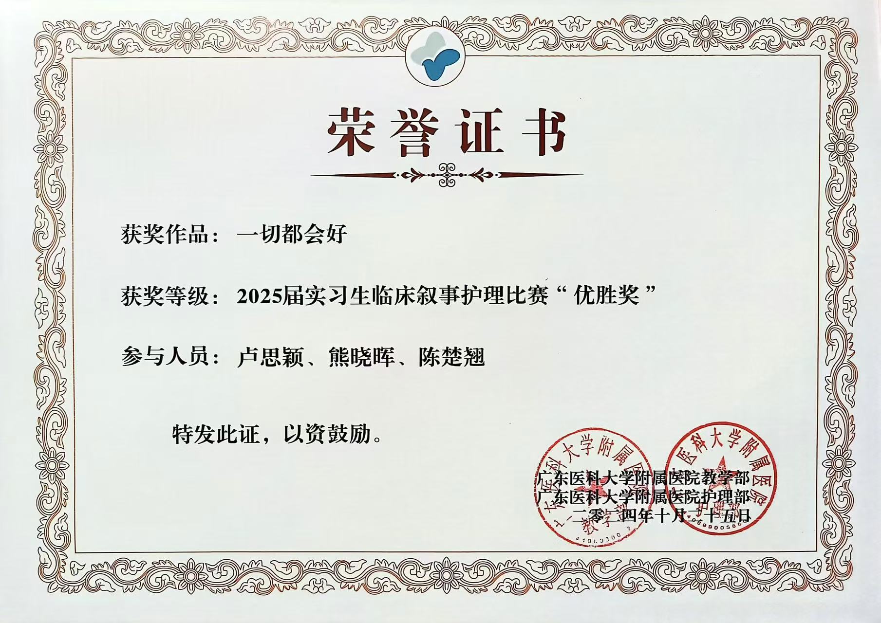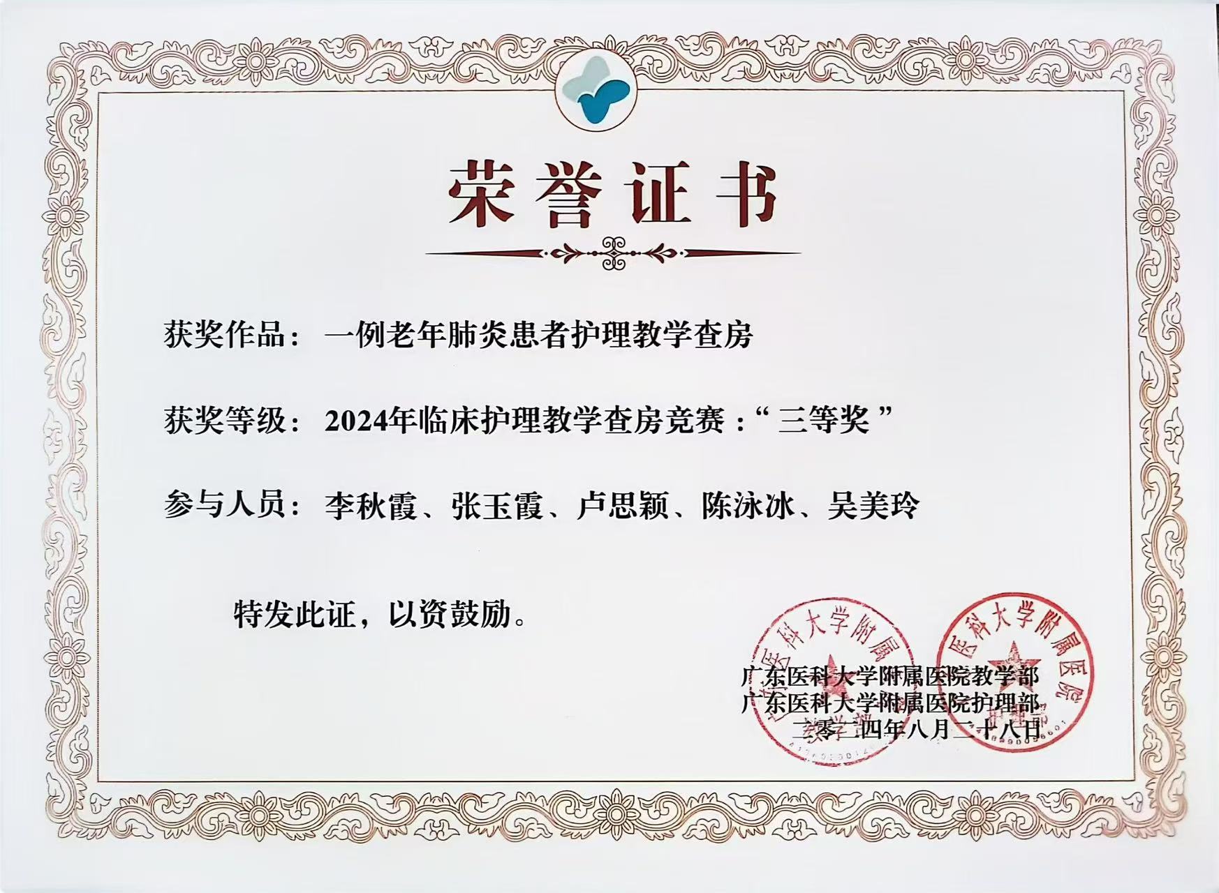 22护理6班的卢思颖与其他120名同学于2024年7月8日进入到广东医科大学附属医院护理临床实习。该同学作为广医附院的我校实习组组长,认真负责,协助老师管理实习生,同时对自己严格要求,一丝不苟,护理工作细致入微,在轮转到老年医学科时,参与医院教学查房竞赛获 “三等奖”,轮转到肾内科时获叙事比赛“优胜奖”。