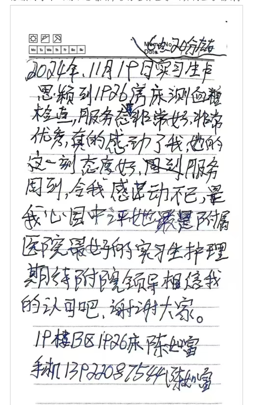 不仅如此,该同学在实习期间养成了良好的工作态度,用自己的专业知识、医者仁心、耐心与人文关怀赢得了患者的认可。在肾内科实习期间,收到患者的表扬信,赢得患者赞誉。