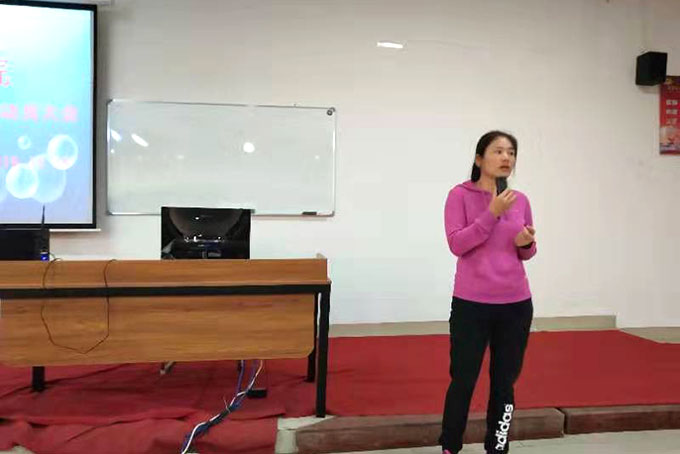 教师代表、体育学院院长助理杨毅华发言,她从安全意识(人身安全、财产安全)、纪律意识(遵守学校纪律、实习单位纪律)和锻炼意识(去学习去锻炼的工作态度,忌眼高手低)三方面对学生实习提出建议。