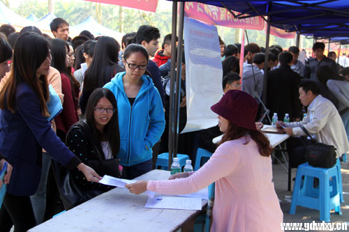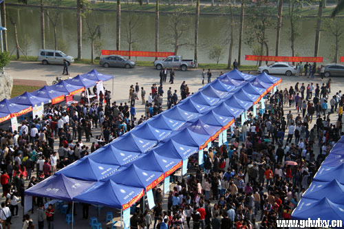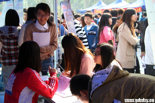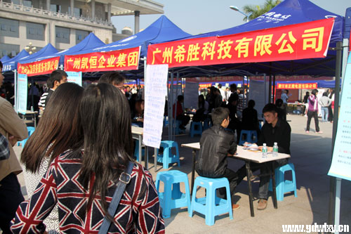 在2014年广东文理职业学院精心策划布置的招聘会场上,光宝电子(广州)有限公司、阿波罗(中国)有限公司、广州市美益香料有限公司、广州市万绿达集团有限公司、广州广高高压有限公司、广州旺旺食品有限公司门前挤满了前来应聘的大学生。